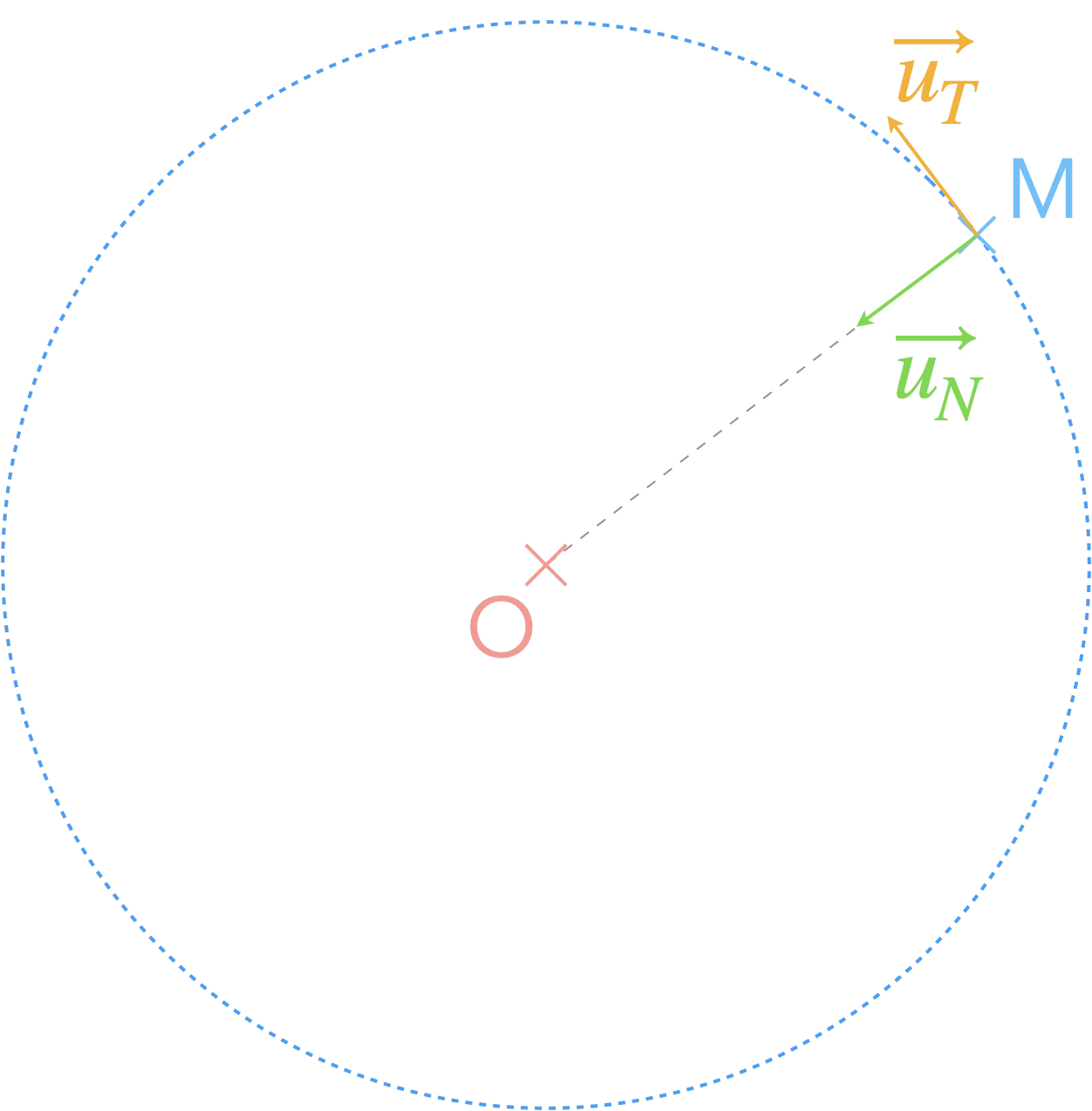 Rq : $R$ est le rayon de l'orbite ($R=\mathrm{OM}=\mathrm{cte}$).