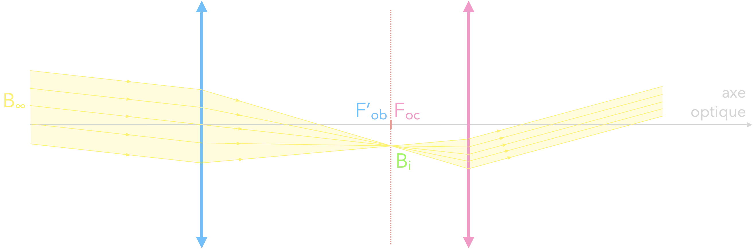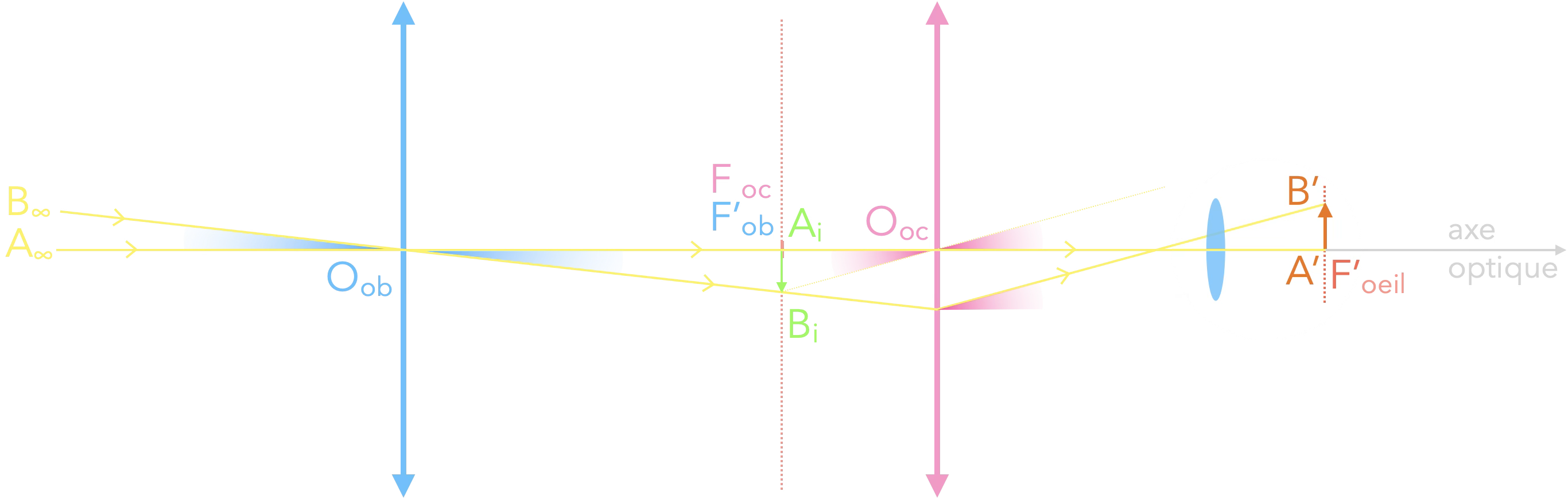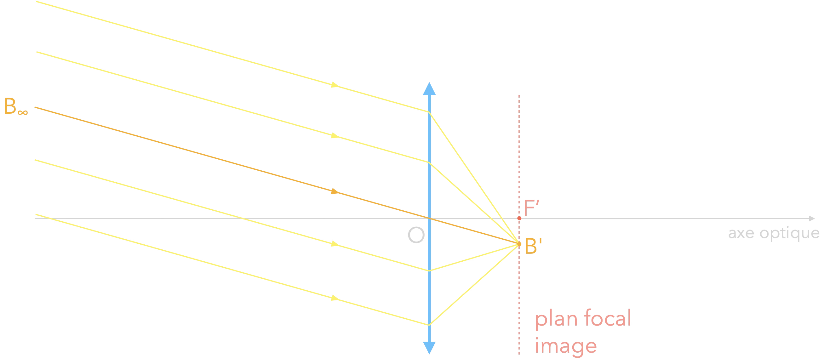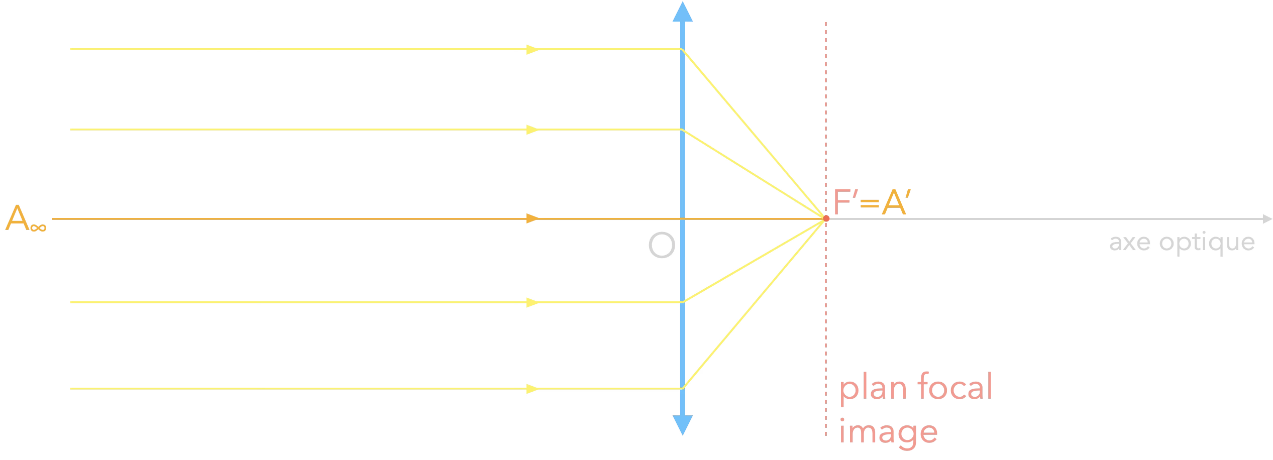 de l’objet lointain $\color{#FFF056}\mathrm{A_\infty B_\infty}$ par l’objectif.