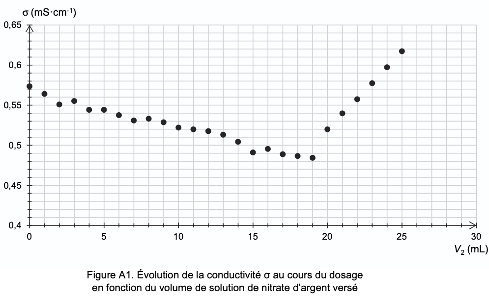 Si les conductivités du titrant et du titré sont différentes, l’équivalence sera repérable par une rupture de pente dans la courbe $\sigma=f(V_B)$.